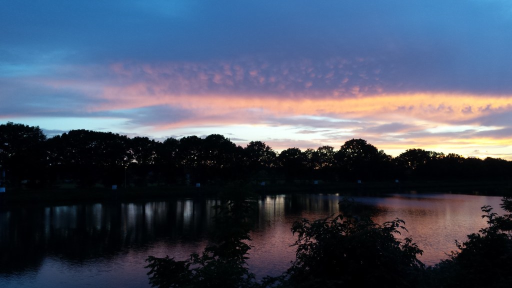 Sonnenuntergang. Klarer Himmel, die organgefarbene Scheibe berührt den Horizont.