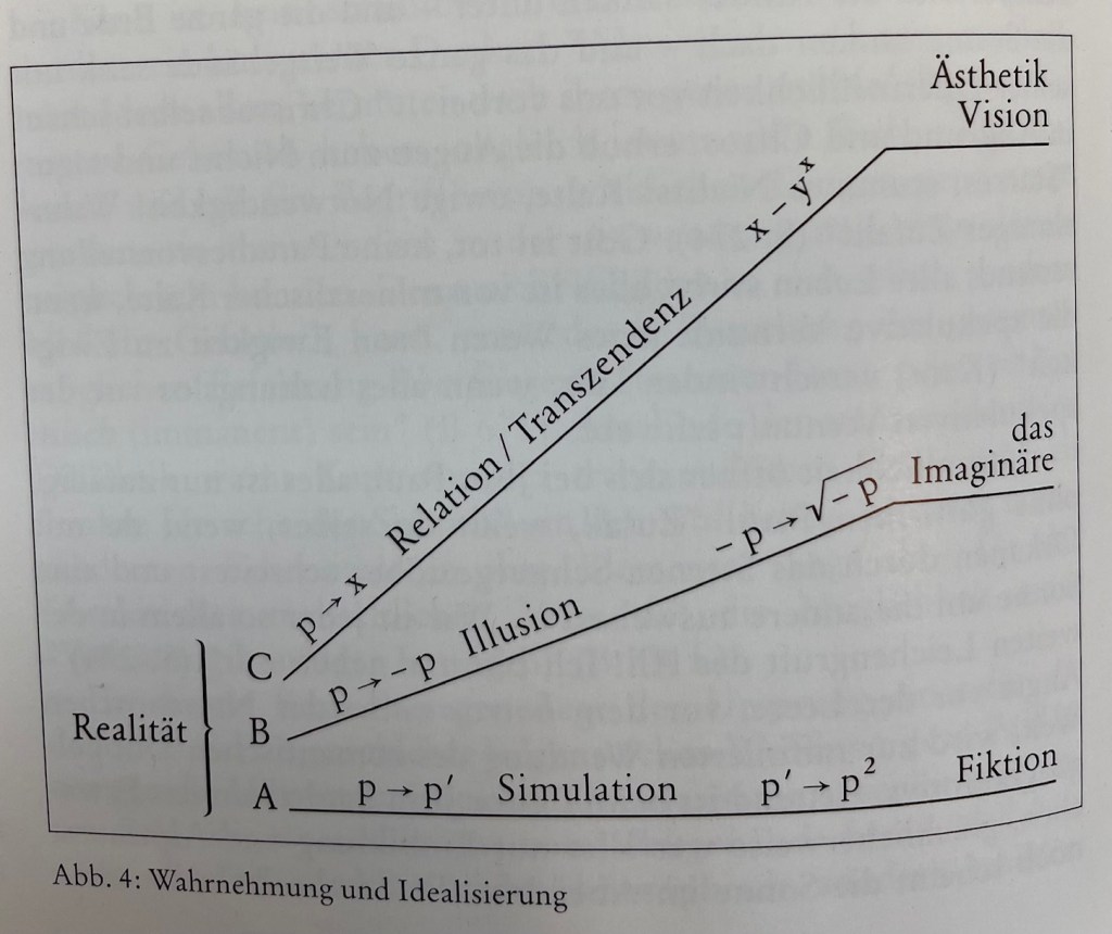 Überlegt man sich das Schema von Realität und Wahrnehmung, von Irdischem und Idealem, wird dies als geschichtlicher Rundgang simpel so zu fassen sein, wie das erste Schema veranschaulicht. Der Begriff einer Simulation lässt sich nur bedingt auf Kunst anwenden, da Kunst allemal simulierter Prozess ist und war. Solange Kunst als abhängig, dienstbar als unmittelbare oder vermittelte Magd von Politischem, Psychischem oder Soziologischem angesehen wurde, verblieb sie Ausdruck von Alltags-Realität.