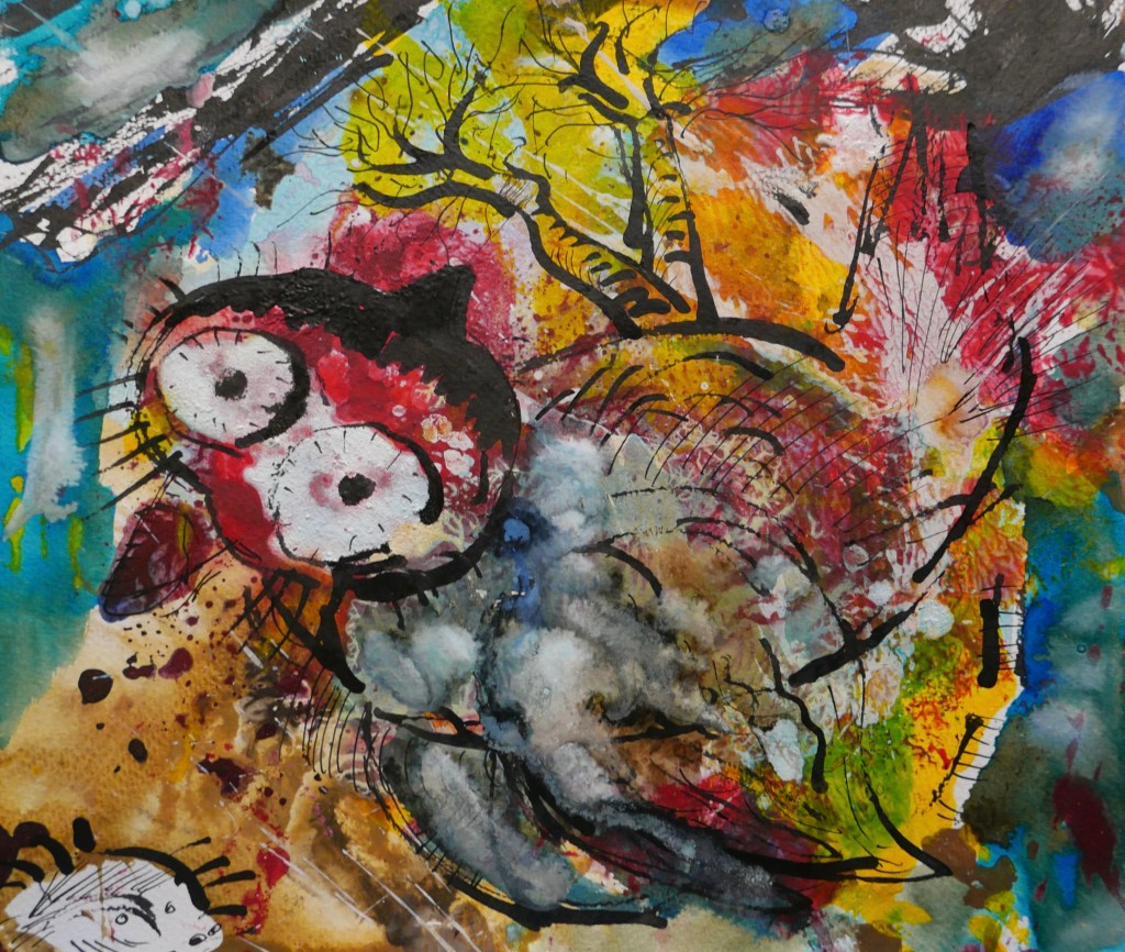 Die Fenster haben gezittert und damit eine Metaphysik des Weltalls geschaffen. Glasscheiben sind herabgefallen. Ein Kranker klagt: halb durch seinen riesigen Zungenmund und ganz durch den After seines Rückens.