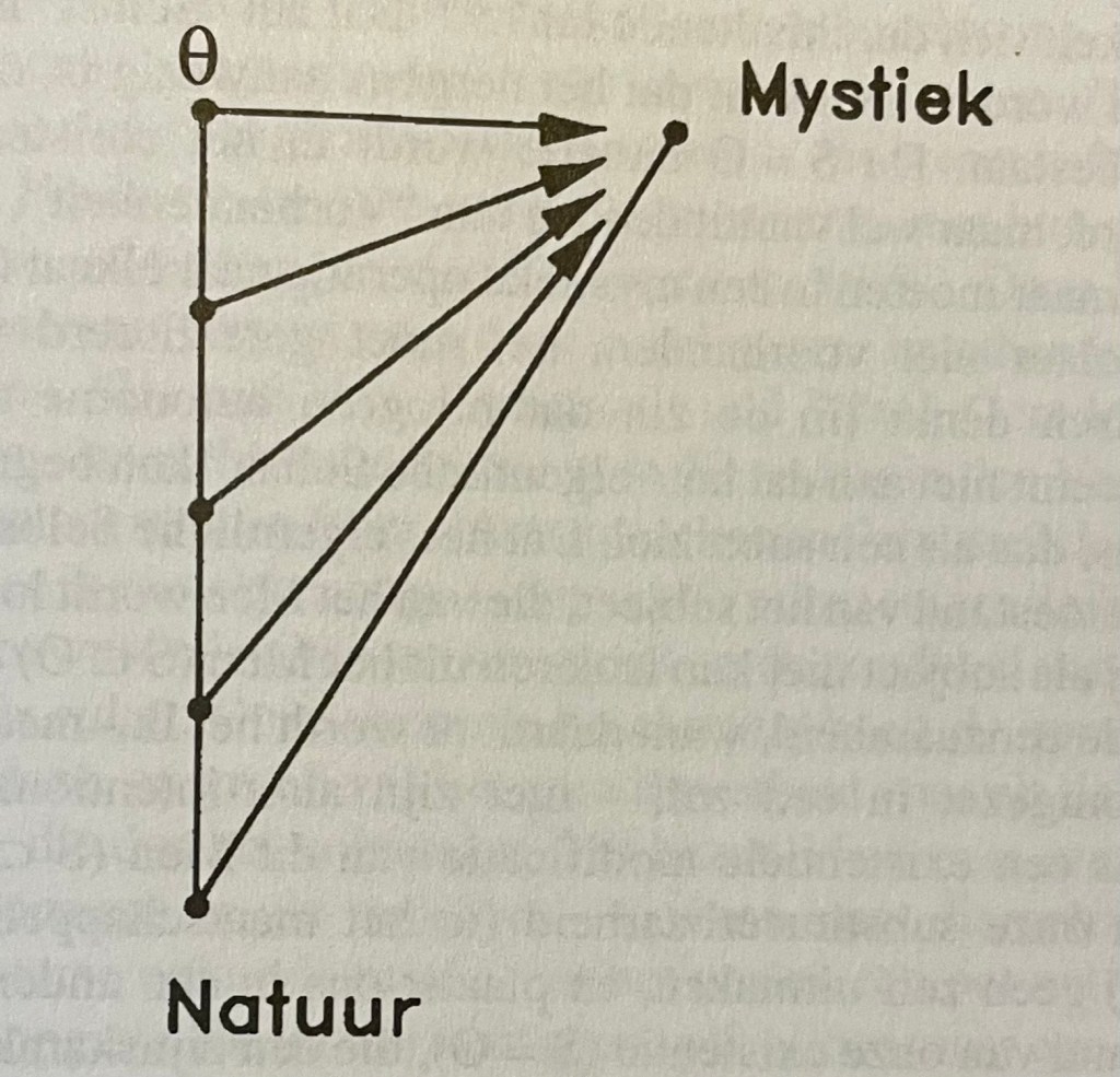 Ik stelde reeds voor uit te gaan van de reeds in de kosmos gerealiseerde numinositeit. Wanneer we deze extrapoleren kunnen we alleen maar in een limietsituatie terecht. omdat de sprong vanuit het relatieve naar het absolute – zoals ook Leibniz2010 wist – niet kan gemaakt worden. Dit betekent dat men oneindig kan doorgaan met het spiritualisatieproces zonder ooit het absolute Numen te bereiken. In theïstische termen kunnen we stellen dat God de limiet is van de “goddelijkheid die in de kosmos wordt opgebouwd. Als, bijvoorbeeld, de vergeestelijking van de wereld resulteert in liefde is het zinvol de asymptoot van dit proces, voor te stellen als de totale liefde. Maar precies hier bots ik op het Mysterie zelf. Men zou zich kunnen voorstellen dat de spiritualisatie een aflopend proces Is, eindigend in een volmaakte wereld;2011 dan is God gerealiseerd en heeft het concept verder geen betekenis meer. Het Mysterie is in de onverborgenheid getreden. maar de praktijk van het mystieke leven leert ons dat deze onverborgenheid niet van rationele aard Is: het is niet zo dat wij het Mysterie kennen. Mystiek berust op beleving. Deze mystieke ervaring is een universele functie die zich als een gestaltenreductie ontwikkelt en steeds dichter naar de eenheidservaring S = O toegroeit. Ik kan deze functie alleen als een reductie beschrijven, vandaar dat ze een negatieve coëfficiënt moet hebben. Ontologisch kan ik de limiet dan ook alleen als een vorm van Niet-zijn beschrijven, epistemologisch kan ik de functie alleen als een “reductie op nul” beschrijven. Deze S = O situatie heeft duidelijk een absoluut karakter. Ik kan me als mens echter geen situatie voorstellen waarin ik totaal in het mysterie opga zonder op te houden te bestaan. Dit hebben de boeddhisten duidelijk aangevoeld toen ze de tijdelijke S = O relatie aanduidden als nirvāna, en de totale ondergang na de dood in deze relatie – uiteraard zonder resterend karma – als parinirvāna 2012 Dit parinirvāna kan slechts negatief geduid worden – er is zelfs geen geluksbeleving, want er is geen subject meer -, en is dan ook het blijvend mysterie van dit bestaan.