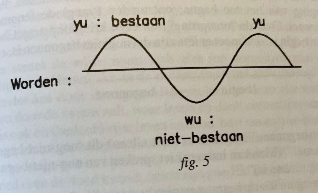 De taoïsten hebben deze “Ewige Wiederkehr des Gleichen” tot universeel principe gemaakt: worden is een cyclische beweging waarin bestaan en niet-bestaan alterneren. De Tao-te-ching, ch. 16 zegt: “De tienduizend dingen worden allen actief, maar ik zie ze terugkeren. De dingen groeien weelderig (als planten), maar ze keren allen terug naar hun wortel. Terugkeren naar de wortel noemen we: rust. Dit is terugkeer naar zijn bestemming”.540 En in ch. 40 lezen we: “Terugkeer is de beweging van het Tao”.541 Chuang-tzŭ zegt in ch. 40: “Komt het tot een einde, dan begint het opnieuw”.542 Het mooiste symbool dat alles wat hierboven gezegd is, samenvat is het yin-yang symbool. Dit komt in de Tao-te-ching slechts één keer voor, namelijk in ch. 42: “Uit het Tao ontstaat het Ene ( d.i. de ongedifferentieerde wereld van het bestaande, yu, dus het ch’i); uit dit Ene ontstaat de twee (= Yin en Yang), uit Twee ontstaat de Drie (vermoedelijk Hemel, Aarde en Mens); uit deze Drie ontstaan de tienduizend dingen. Deze dingen dragen achteraan het Yin en vooraan het Yang. Hun botsende ch’i veroorzaken de harmonie (ho)”.543
