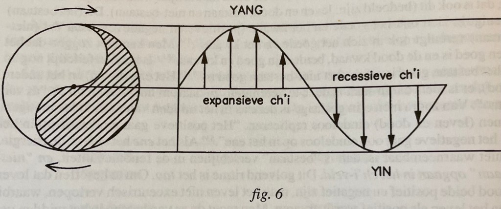 Het Tao, dat de weg is waarlangs het worden verloopt, heeft een cyclisch karakter: en is dus noodzakelijk expansie en recessie, yang en yin. Dit staat overduidelijk in Hsi-tz’ŭ, een appendix bij de I-ching: “i yin i yang chih wei tao 一陰一 陽 乙 謂 道 eenmaal yin eenmaal yang, dat noemt men tao”.544 Precies zoals tao is yin-yang geen ding, maar een wordingspatroon. Dit betekent dat alle fenomenen in dit patroon kunnen beschreven worden: zo bijvoorbeeld het tao van het etmaal, dat bestaat uit een yang-fase, de dag, en een yin-fase, de nacht; of het tao van het jaar, dat een yang-fase -lente/zomer-kent en een yin-fase -herfst/winter. Als men over yang-ch’i en yin-ch’i spreekt, zijn dit geen twee tegengestelde krachten, die het universum beheersen – als partikels met positieve en met negatieve lading -, maar dezelfde ch’i die zich volgens het tao-ritme, nu eens expansief, dan weer recessief gedraagt.